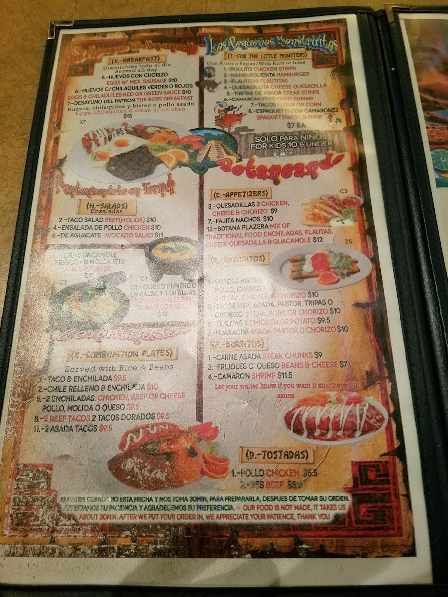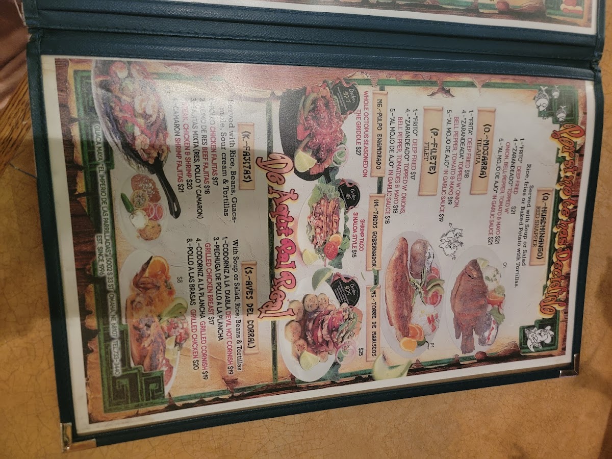 The menu offers a range of Mexican and Latin American dishes, presenting a variety of options suitable for casual dining. Visitors can find a selection of appetizers, main courses, and beverages organized across several categories.