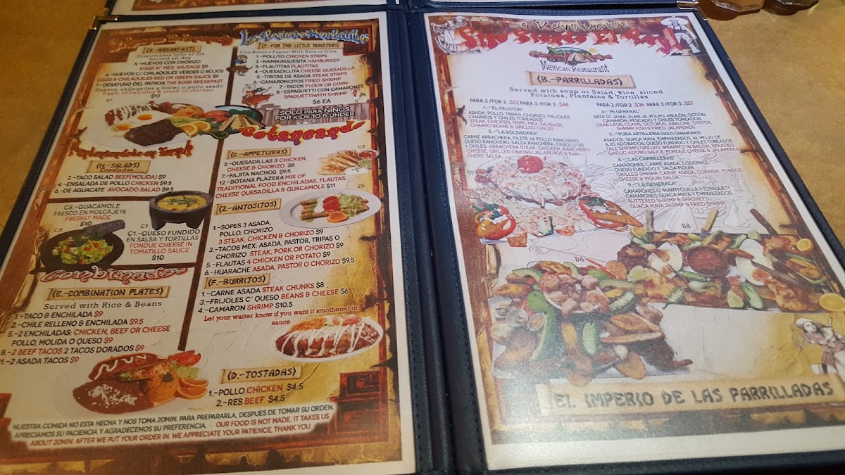 - Main Courses: Features a variety of traditional and contemporary Mexican dishes including fajitas with mixed proteins (beef, chicken, shrimp), tacos, burritos, and specialty items like Carne Asada, Menudo, and several molcajete options.